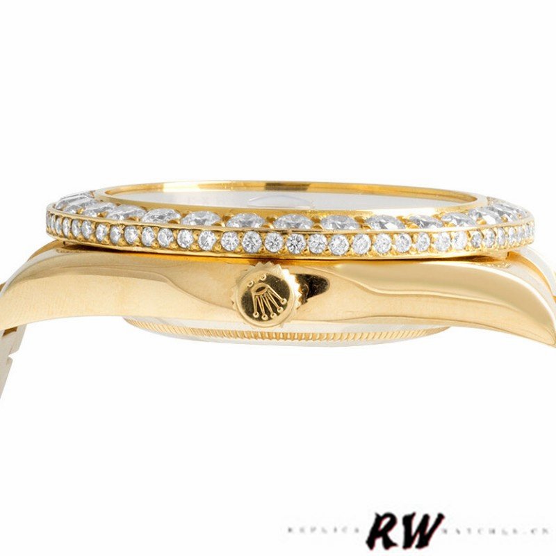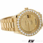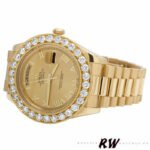 Rolex Day-Date 218348 Champagne Roman Dial 41MM Mens Replica Watch,has a 41mm Yellow gold case that has a solid case back with Screw Down Crown and Diamonds Bezel.Scratch resistant sapphire crystal with Cyclops magnifier.Champagne Dial with Roman Numerals Hour Markers,Date Window Displayed at 3 O’Clock,Day Window Displayed at 12 O’Clock,Yellow gold three-piece-link Presidential bracelet with a fold-over clasp.