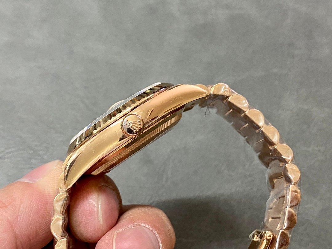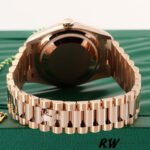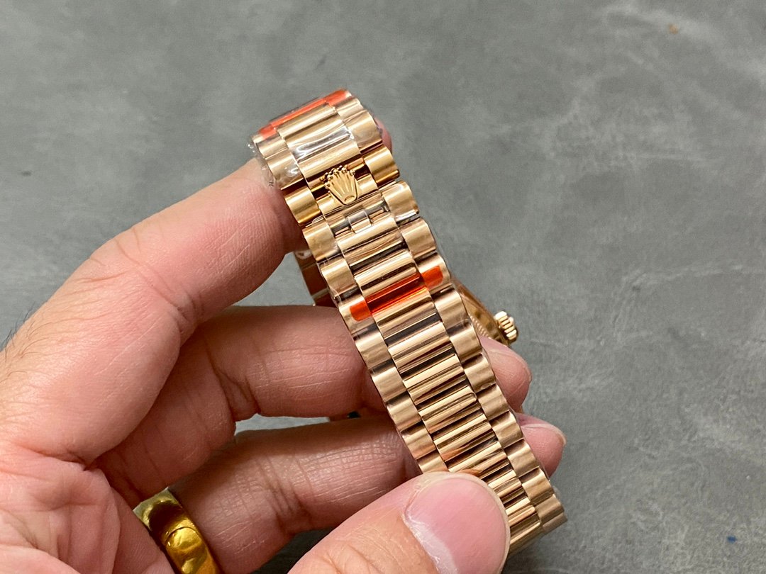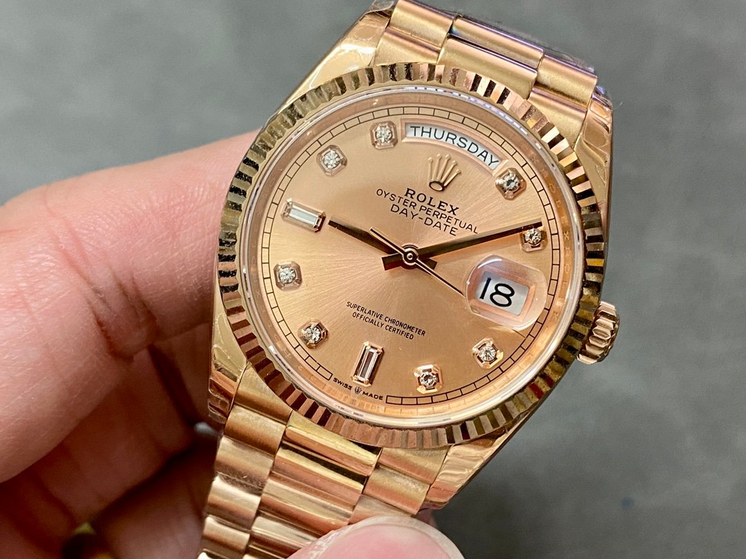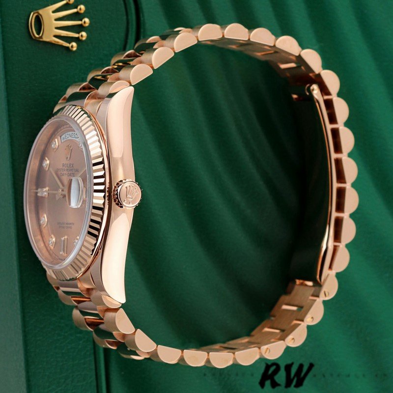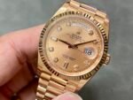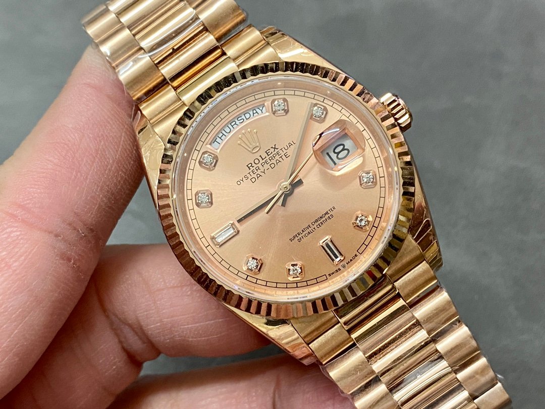 Rolex Day-Date 128235 Everose Gold Pink Rose Dial 36MM Unisex Replica Watch, 36.0 mm Everose rose gold oyster case in diameter, screw-down back, screw-down crown with twinlock double waterproofness system, fluted bezel, Scratch resistant sapphire crystal with cyclops magnifier, Pink Rose Dial with Diamond Hour Markers, Outer minute and 1/2 seconds divisions, aperture for day at 12, aperture for date at 3. Everose gold President bracelet with semi-circular three-piece links, concealed folding Crownclasp buckle.