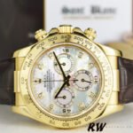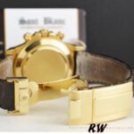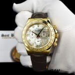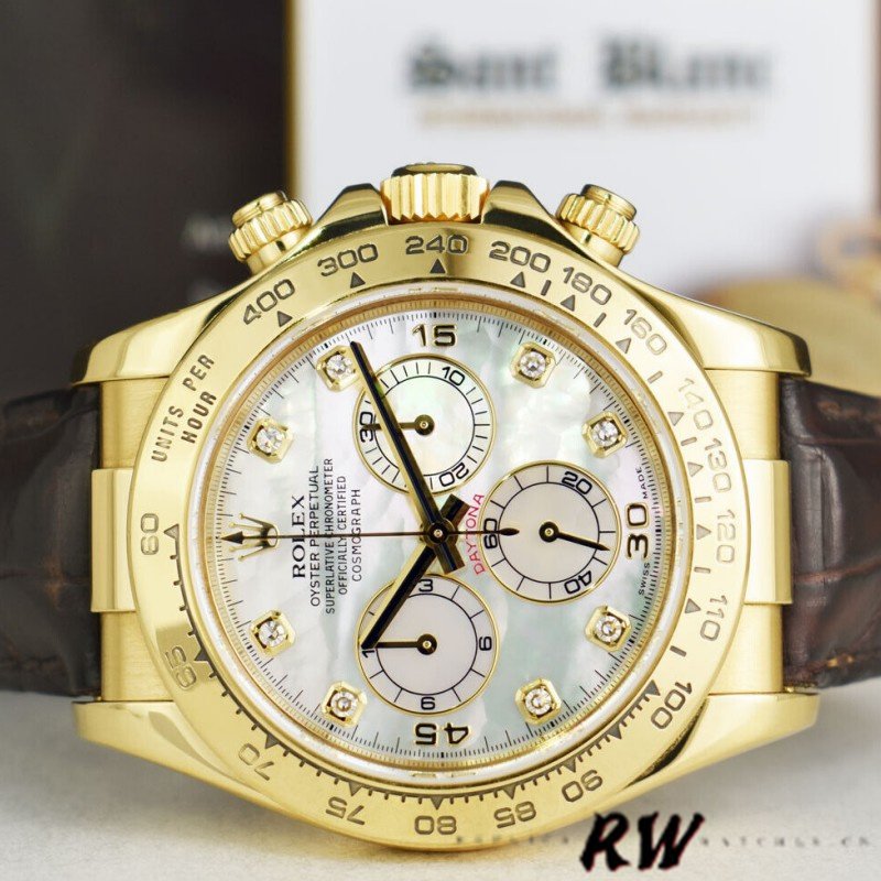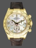 Rolex Daytona 116518 MOP Diamond Dial Yellow Gold 40mm Mens Replica Watch.40mm Yellow gold Case. Fixed Tachymeter Engraved Bezel. Scratch resistant sapphire crystal. Mother of pearl dial with diamond hour markers. Small seconds hand at 6 o’clock. Centre chronograph hand, 30-minute counter at 3 o’clock and 12-hour counter at 9 o’clock. Brown leather strap with yellow gold deployent buckle.which looks pretty stunning and high-end.