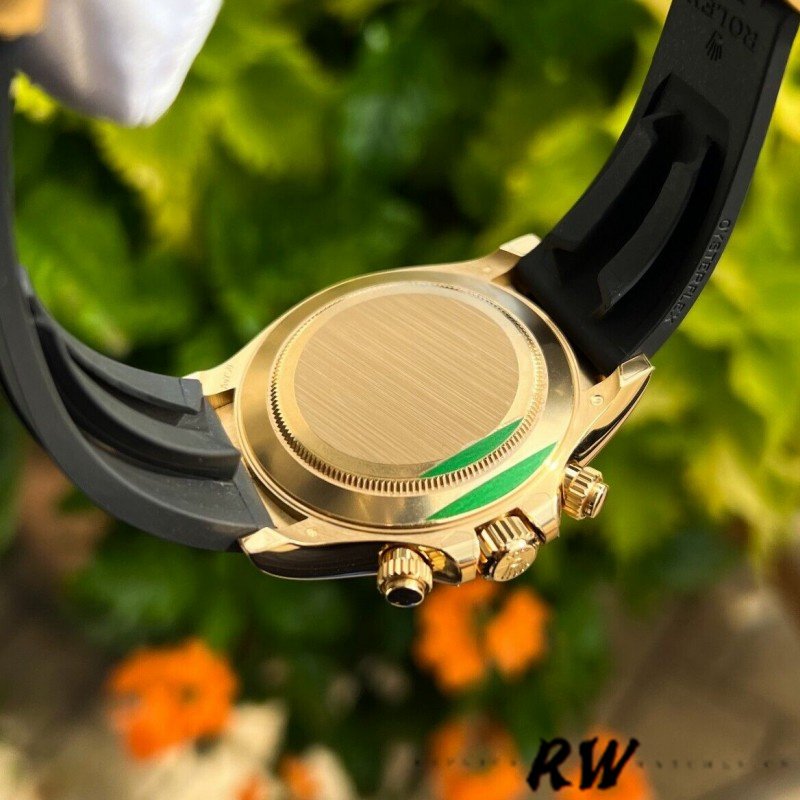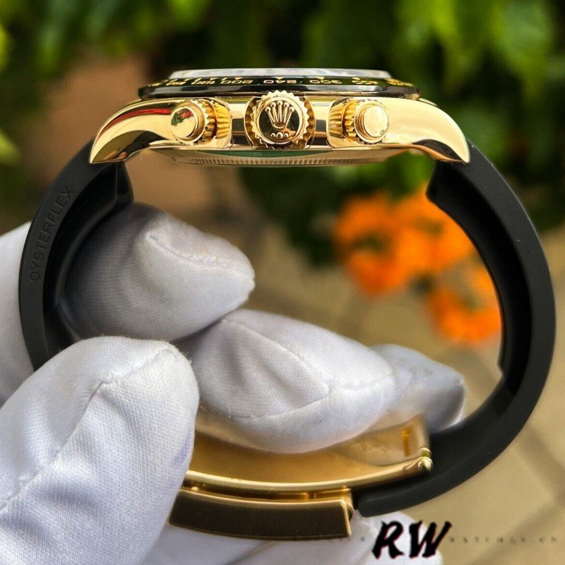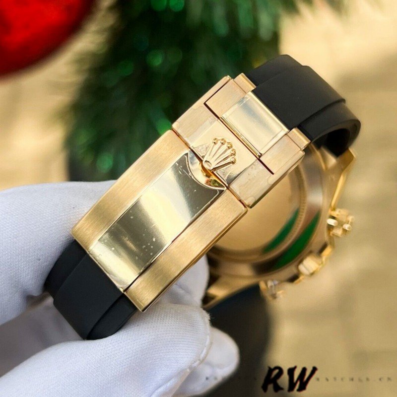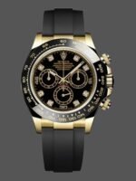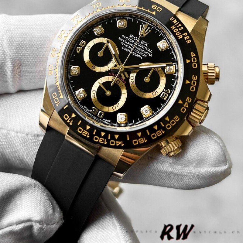 Rolex Daytona 116518LN Black Diamond Dial 40mm Mens Replica Watch.40mm yellow gold case, screw-down yellow gold back, screw-down crown and push buttons with Triplock triple waterproofness, black monobloc Cerachrom bezel with engraved tachymetric scale, scratch-resistant double anti-reflective sapphire crystal, Black dial, 8 diamond hour markers,chronograph central second hand, 30-minute counter at 3 o’clock, and 12-hour counter at 9 o’clock,Black Rubber strap.Oysterlock folding safety buckle.