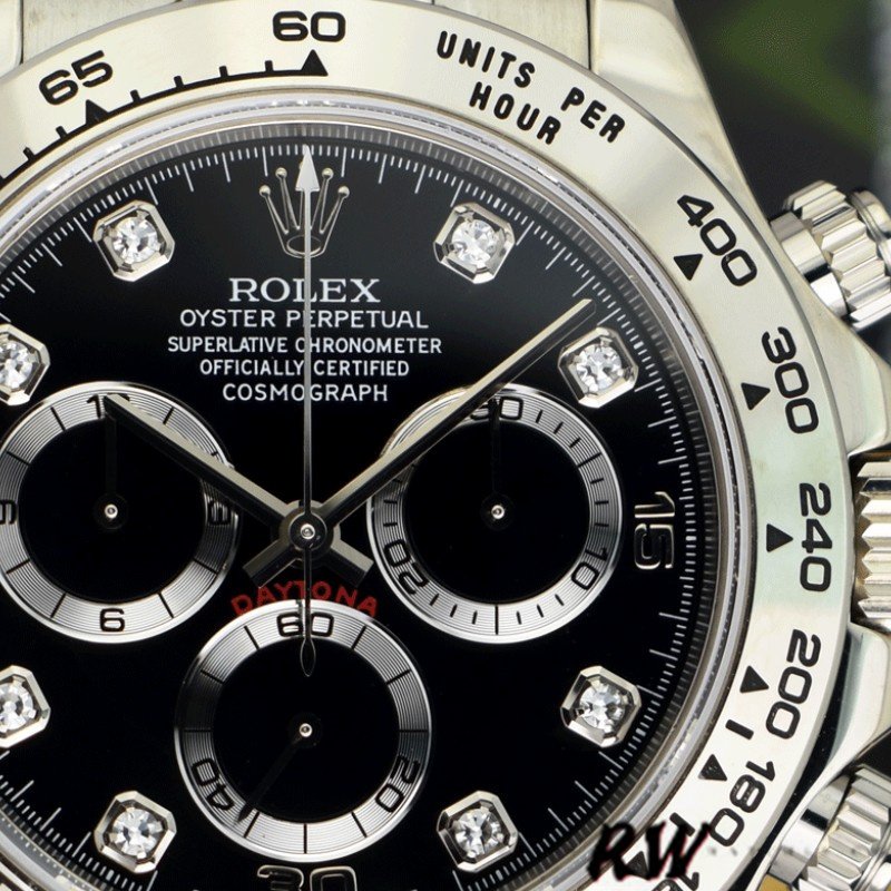 Rolex Daytona 116519 Black Diamonds Dial 40mm Mens Replica Watch.40mm white gold case. Black dial with silver subdials and diamond indexes, chronograph, small seconds at 6, luminous hands, A black crocodile leather strap and whitegold tachymeter bezel. A scratch-resistance sapphire crystal.