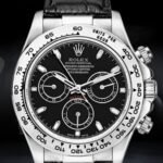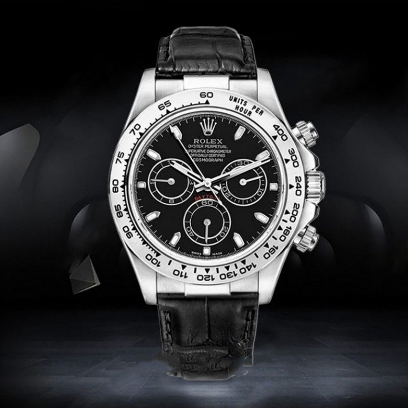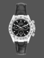 Rolex Daytona 116519 Black Leather strap Black Dial 40mm Mens Replica Watch.40mm Stainless Steel case and bezel.Minute markers around the outer rim. Black dial. Black Leather Strap with deployant clasp. Luminous Index.The bright luminous sticks marked on the dial will light up when you leave the light.The hands of the replica watch is silver-tone which is pretty cool and fashionable.