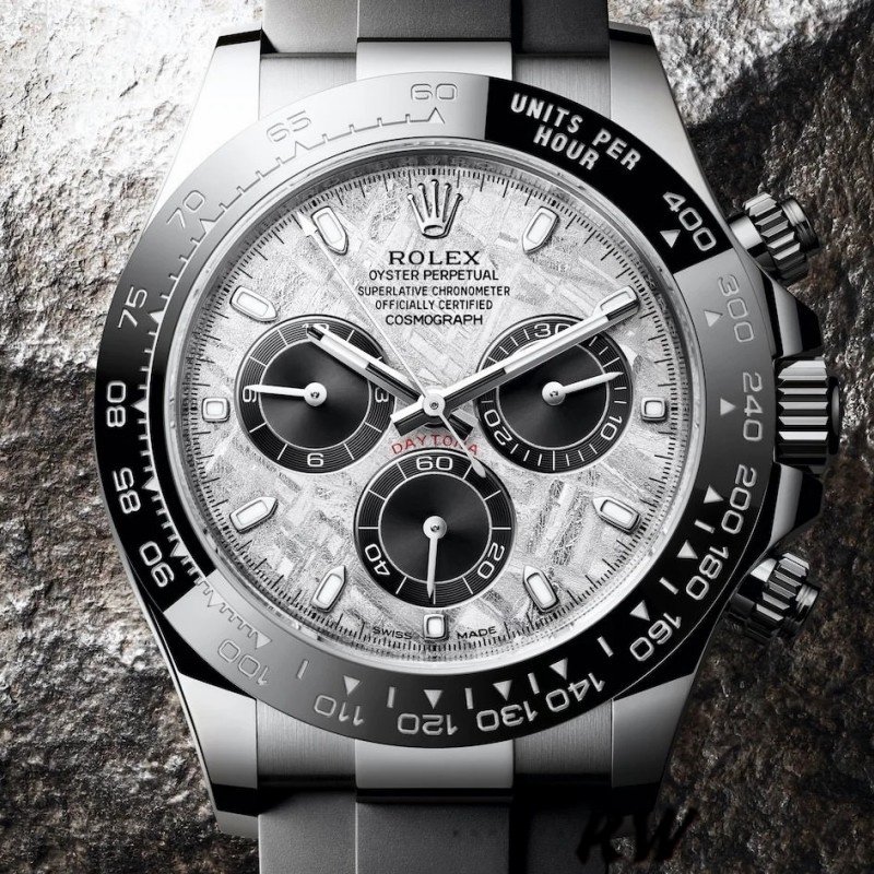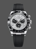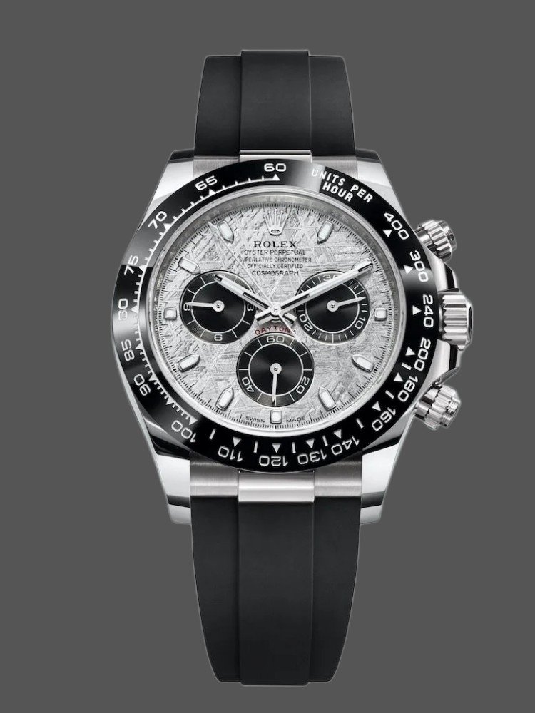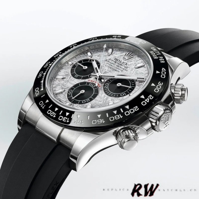 Rolex Daytona 116519 Meteorite and Black Dial 40mm Mens Replica Watch.40mm White gold case, Black monobloc Cerachrom bezel in ceramic with moulded tachymetric scale, scratch-resistant anti-glare sapphire crystal glass mirror, Meteorite dial with black subdials, luminous hour markers, chronograph, small seconds at 6, luminous hands, Black rubber strap with steel folding clasp. The triangular pit pattern is polished with a steel bottom case, and the bottom ring drawing process is meticulous.