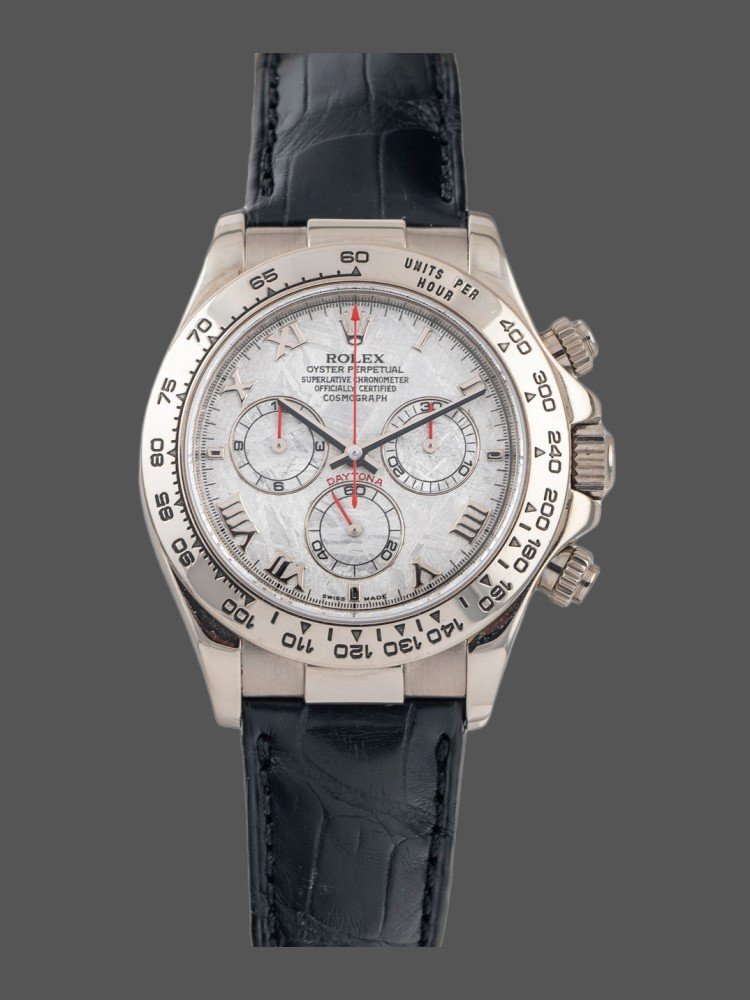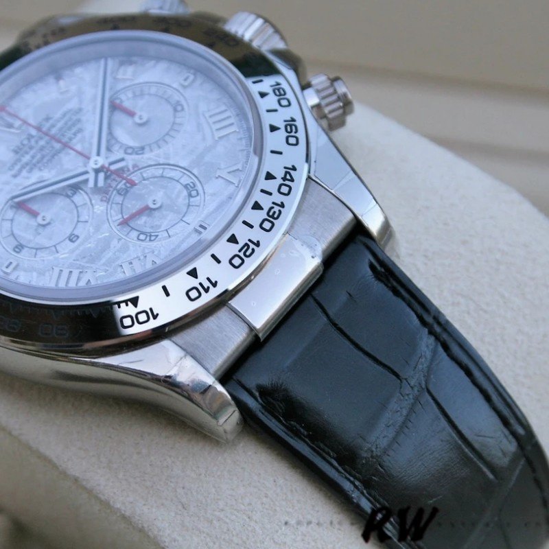 Rolex Daytona 116519 Meteorite Dial Leather strap 40mm Mens Replica Watch.40mm white gold case with white gold tachymeter bezel. Meteorite dial with Roman numeral hour marker. 30 minute recorder at 3 0’clock, small seconds at 6 0’clock, 12 hour recorder at 9 0’clock,The red hands for the chronograph and subdials really pop on this piece and go nicely with the sheen from the meteorite dial!Black leather strap with fold over clasp with safety. Will fit up to 7-Inch wrist.