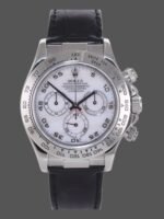 Rolex Daytona 116519 Mother of Pearl Arabic Dial 40mm Mens Replica Watch.40mm White Gold case,bezel, winder and deployant clasp, Mother of pearl dial with Arabic numeral hour markers. Minute markers around the outer rim. 30 minute recorder at 3 o’clock, 60 second recorder at 6 o’clock, 12 hour recorder at 9 o’clock,Black leather strap, sapphire crystal glass.