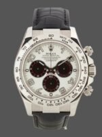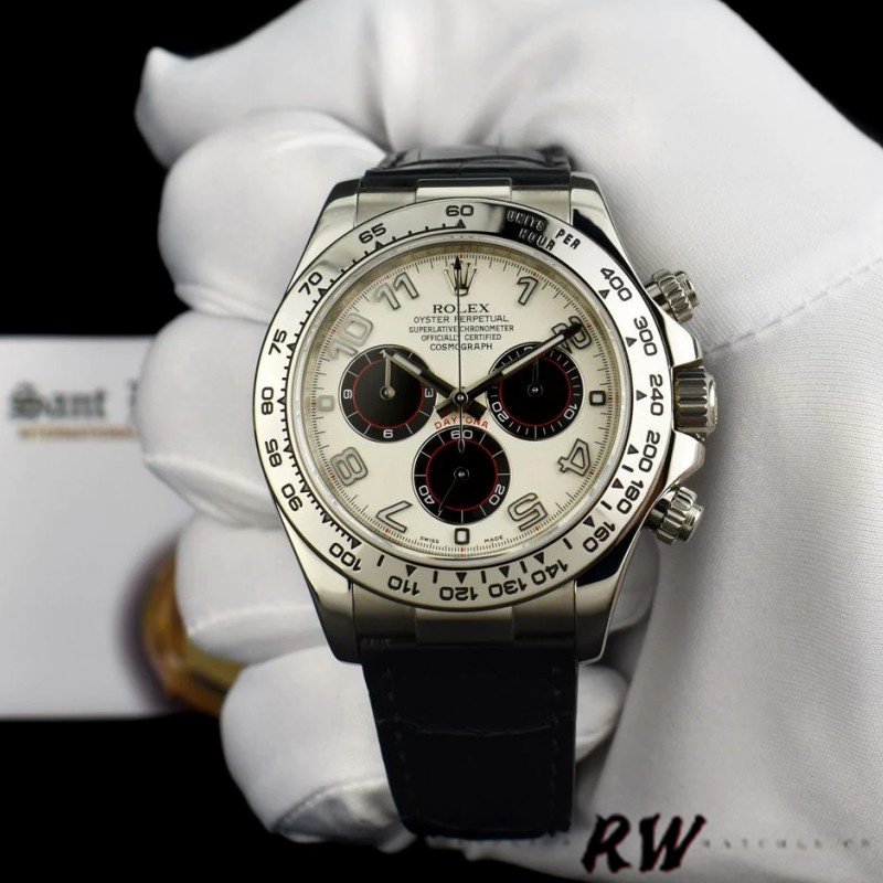 Rolex Daytona 116519 “Panda” Dial Black Leather Strap 40mm Mens Replica Watch has a White Gold 40 mm Round Case.Polished Stainless Steel Tachymeter Bezel.large luminous Arabic hour indicators and black sub-dials with white and red accents.White Dial with Hour, Minute, Very Smooth Sweeping Second Hand, Three Functional Black Sub Dials, Arabic Numerals Hour markers.Black alligator skin straps which are totally hypoallergenic and with a white gold folding deployment clasp.