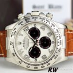 Rolex Daytona 116519 “Panda” Dial Brown Leather Strap 40mm Mens Replica Watch has a White Gold 40 mm Round Case.Polished Stainless Steel Tachymeter Bezel.large luminous Arabic hour indicators and black sub-dials with white and red accents.White Dial with Hour, Minute, Very Smooth Sweeping Second Hand, Three Functional Black Sub Dials, Arabic Numerals Hour markers.Brown alligator skin straps which are totally hypoallergenic and with a white gold folding deployment clasp.
