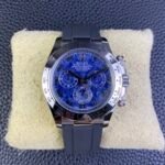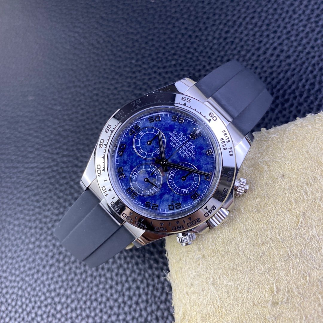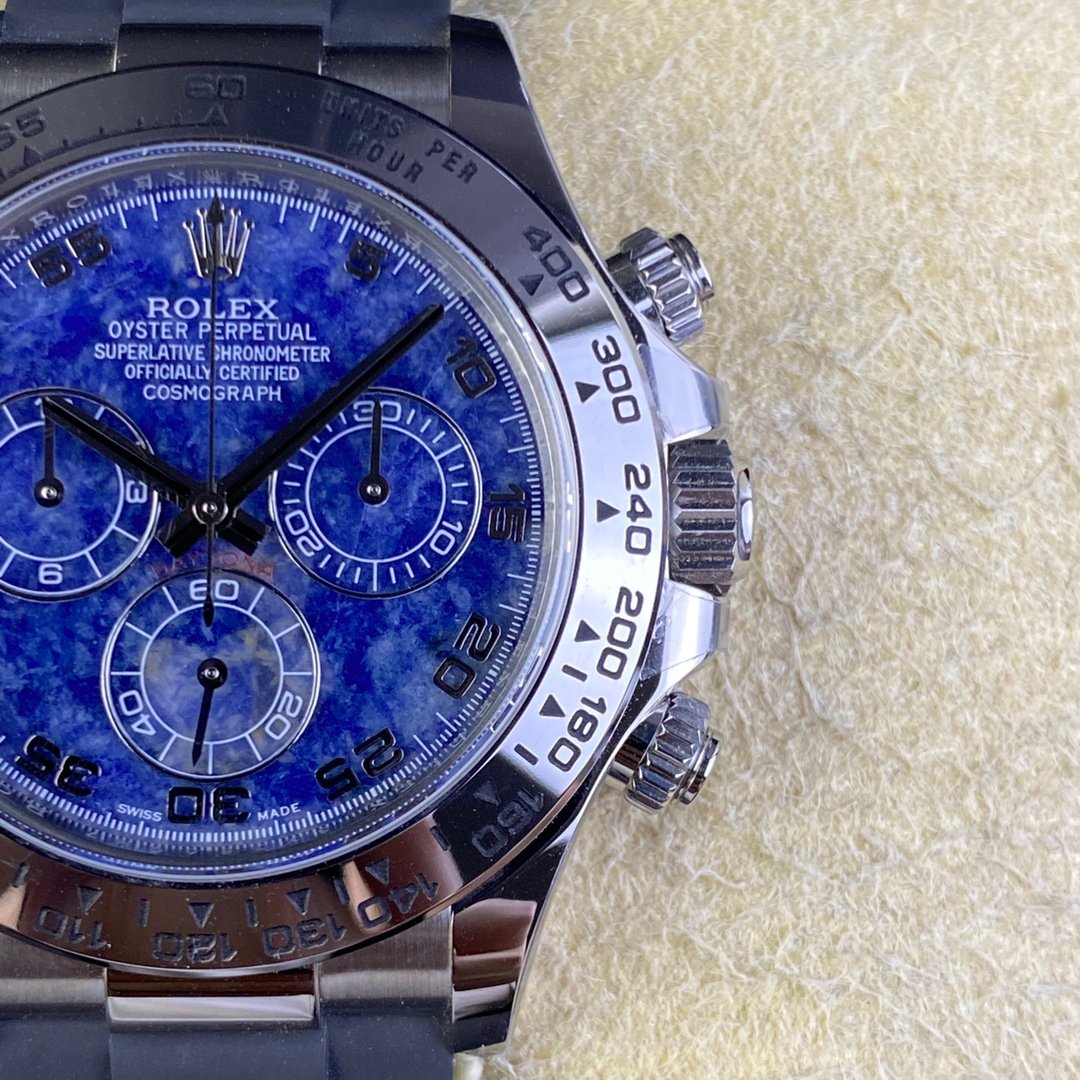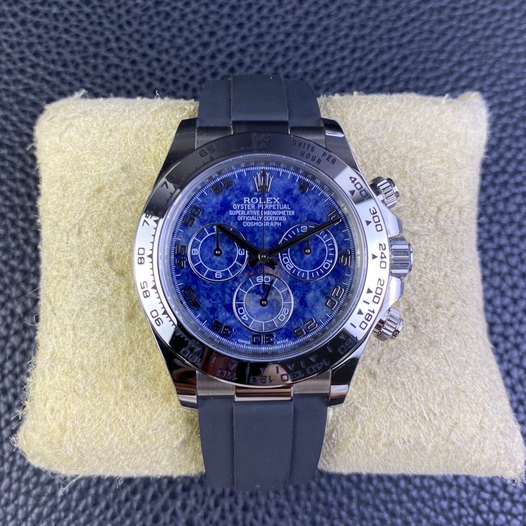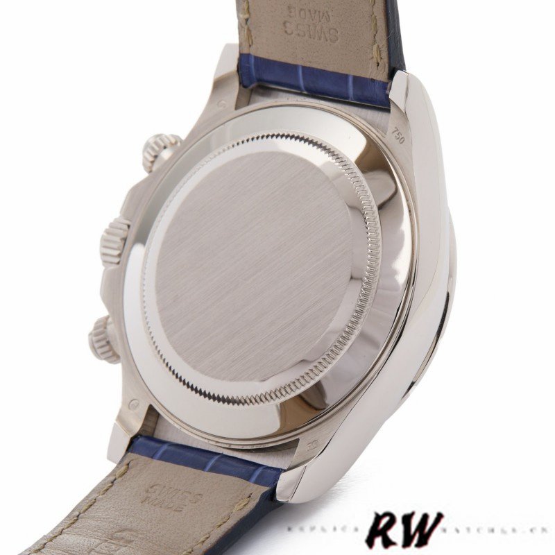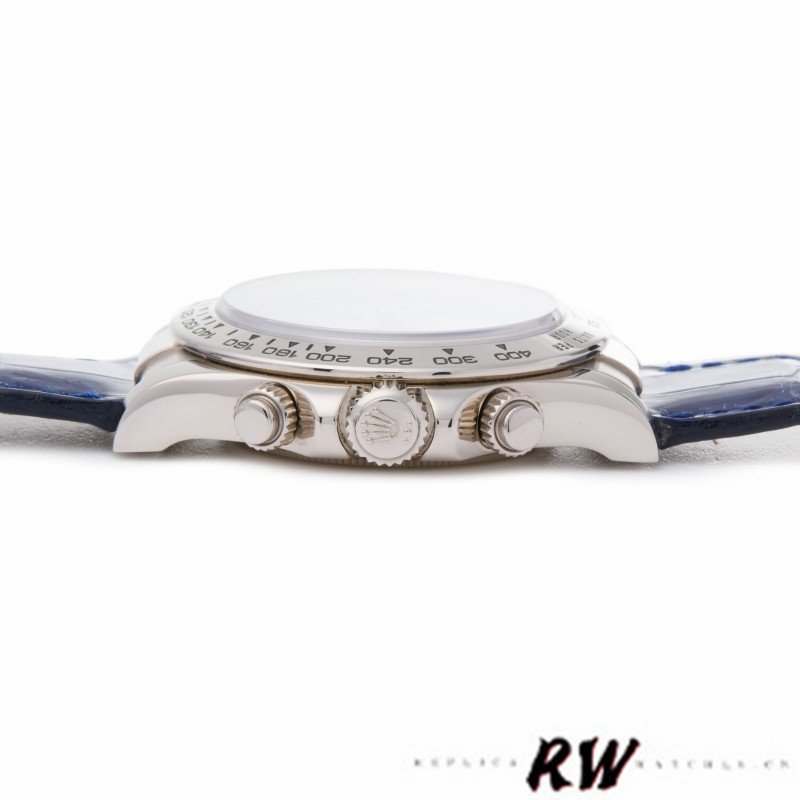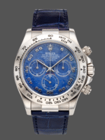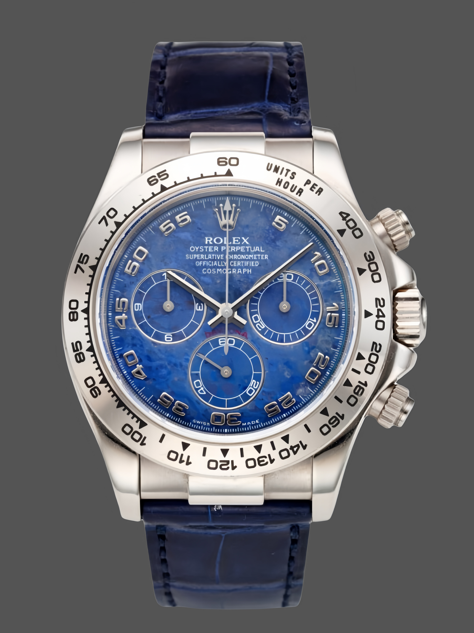 Rolex Daytona 116519 Sodalite Arabic Dial Blue Alligator Leather 40mm Mens Replica Watch. 40.00mm case size in white gold, sodalite arabic dial on a blue alligator leather bracelet.Featuring a Sodalites blue dial with three sub-dials, fixed engraved tachymeter in a white gold bezel, numeral applied white gold markers, the watch is fitted with a blue alligator leather strap and white gold deployment clasp.