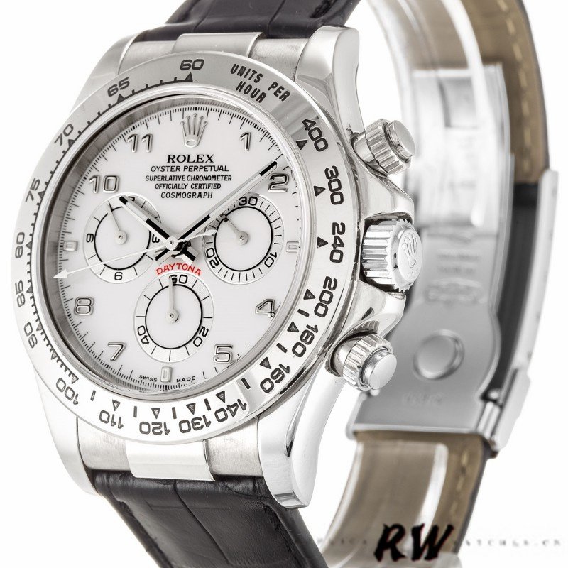 Rolex Daytona 116519 White Arabic Dial Black Leather strap 40mm Mens Replica Watch.40 mm case size with a Round caseback and White Arabic Numeral dial.Black leather strap with fliplock deployant buckle.subseconds and chronograph.
