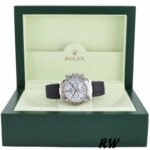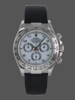 Rolex Daytona 116519 white Arabic dial Black Rubber strap 40mm Mens Replica Watch.40mm white gold Case diameter.White dial with luminous hands and luminous Arabic hour markers. Fixed Tachymeter Engraved Bezel.Black Rubber strap with Pattern.Scratch Resistant Sapphire Crystal.Screw Down Crown and Chrono Buttons,White Gold Deployment Buckle.