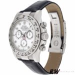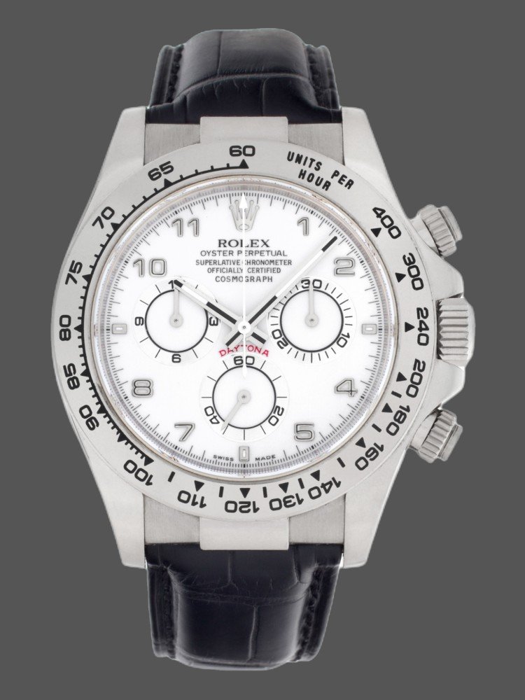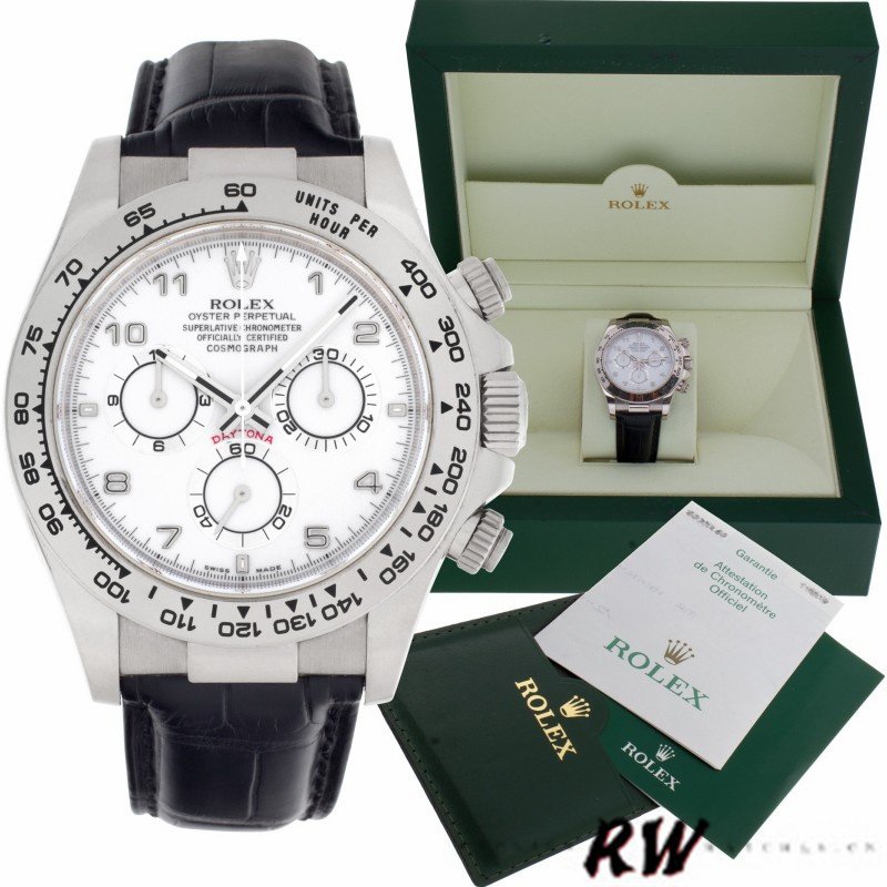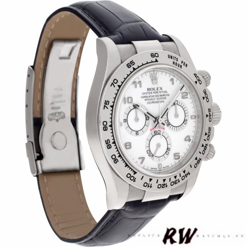 Rolex Daytona 116519 White Dial Black Leather strap 40mm Mens Replica Watch.This Rolex watch has a 40 x 40 mm case with a Round caseback and White Arabic Numeral dial. Black crocodile leather strap with fliplock deployant buckle.