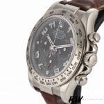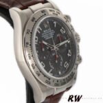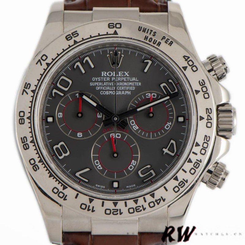Rolex Daytona 116519 White Gold Grey Dial 40mm Mens Replica Watch. The 40mm white gold case Rolex watch has a Triplock winding crown and two screw-down chronograph pushbuttons with fixed domed tachymeter bezel and a scratch-resistant sapphire crystal. The dial is grey with applied luminous white Arabic numeral hour markers and luminous square hour indices at 3, 6, and 9 o’clock, surrounded by a perimeter white 1/5 second/minute scale. It has a Brown alligator leather strap with an white gold deployment buckle, and a scratch resistant sapphire crystal.