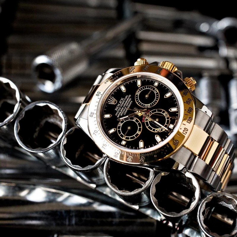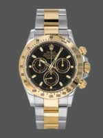Rolex Daytona 116523 Stainless Steel Black Dial 40mm Mens Replica Watch.40mm Stainless Steel Case. The black dial with applied luminescent hour markers. The sub dials are matching black with gold borders and polished god hands.Yellow Gold and Stainless Steel Oyster Bracelet.Sapphire Crystal.The bracelet has eleven full size links and the fold over extension, comfortably fitting up to a 7.3-inch wrist.