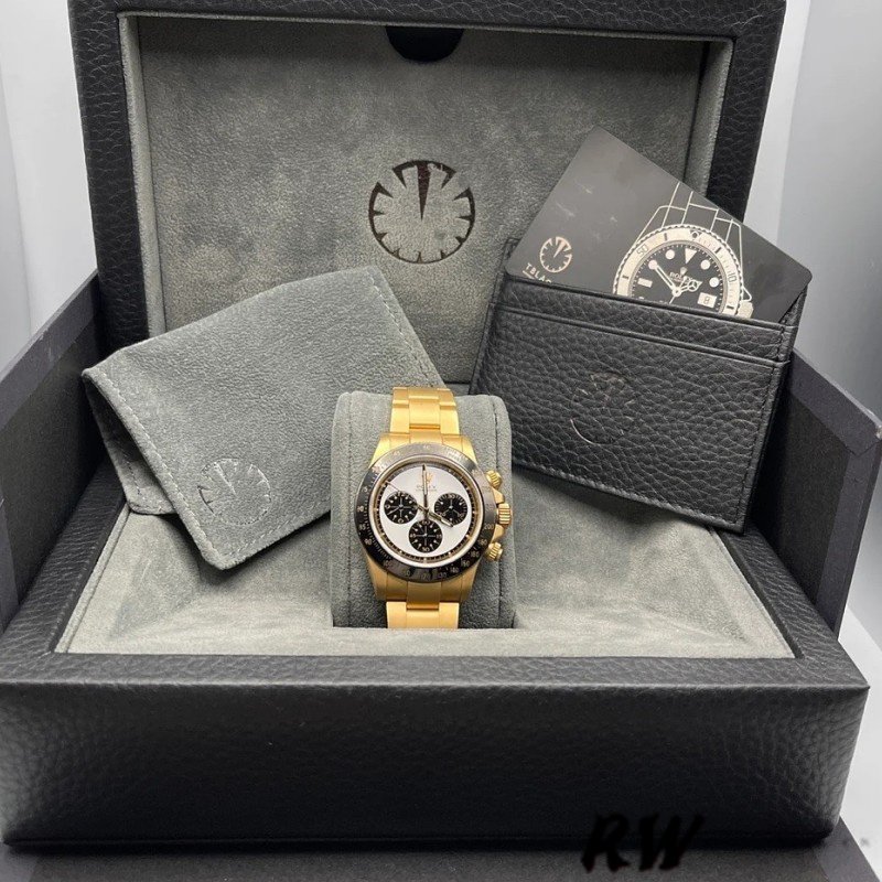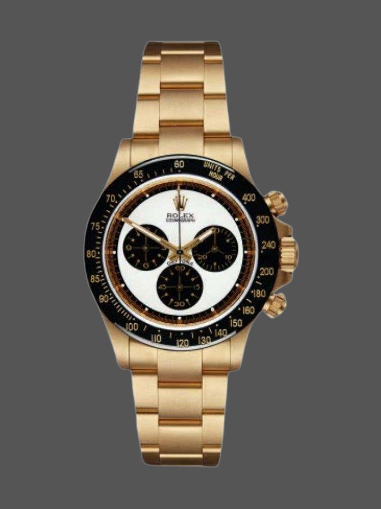 Rolex-Daytona 116528 Yellow Gold White Dial 40mm Mens Replica Watch.40mm Case. Fixed Black and Gold TB-DLC Bezel.Bespoke ‘Vintage Style” Dial with Gold Detailing. Sapphire Scratch Resistance Crystal Glass. Oyster Bracelet.