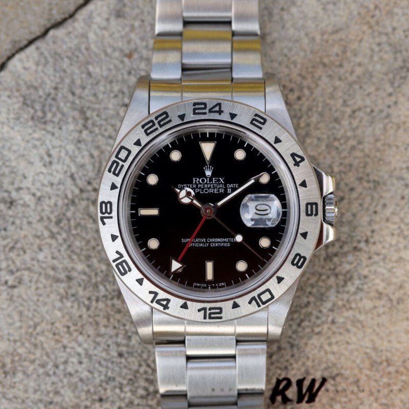 Rolex Explorer II 16550 Stainless Steel Black Dial 39MM Mens Replica Watch,39MM Stainless steel case in diameter.Stainless steel GMT bezel. Scratch resistant sapphire crystal with cyclops magnifying glass. Black dial with luminous dot, baton and dagger numerals, luminous Mercedes hands, red luminous 24 hour hand, center seconds. Date window at 3 o’clock aperture. Stainless steel oyster bracelet with fold over clasp.