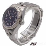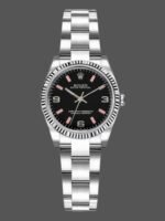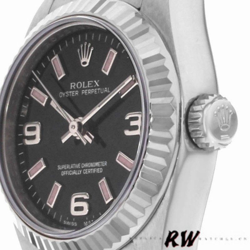 Rolex Oyster Perpetual 176234 Black Dial Fluted Bezel 26MM Lady Replica Watch,26MM Stainless steel oyster case in diameter.White gold fluted bezel. Scratch resistant sapphire crystal. Black dial with Arabic numerals and pink luminous baton hour markers. Stainless steel oyster bracelet with a deployant buckle.