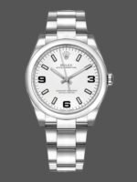 Rolex Oyster Perpetual Air-King 114200 White Dial 34mm Automatic Unisex replica watch. This watch is Stainless steel case with a stainless steel Rolex oyster bracelet.Smooth Fixed domed stainless steel bezel.White dial with luminous silver-tone hands and index hour markers.Arabic numerals mark the 3,6 and 9 o’clock positions.Minute markers around the outer rim.Scratch resistant sapphire crystal.Screw down crown.Solid case back. Fits up to 6-1/2 inch wrist.