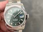 Rolex Sky-Dweller 336934 Fluted Bezel Green Dial 42MM Mens Replica Watch,42mm white Rolesor case comprised of Oystersteel and white gold, screw-down back, screw-down crown with twinlock double waterproofness system, fluted, bidirectional rotatable rolex ring command bezel, scratch-resistant sapphire crystal with cyclops lens over the date, The mint green dial with index hour markers adds a touch of sophistication to this watch, 24-hour display on off-centre disc, second time zone, instantaneous annual calendar at 3 o’clock and rapid-setting of the date, month display via 12 apertures around the circumference of the dial, and stop-seconds for precise time setting, Oyster bracelet with three-piece solid links, folding Oysterclasp buckle with Easylink comfort extension link.
