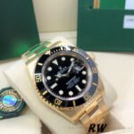 Rolex Submariner 116618 Yellow Gold Black Dial 40mm Mens Replica Watch features a 40mm Yellow Gold case, Unidirectional black ceramic bezel with 60 minute graduation.Black dial with luminous inlay hands and hour markers. Date calendar at 3 o’clock aperture.Scratch resistant sapphire crystal with Cyclops lens,Yellow gold Oyster bracelet with Oysterlock clasp.