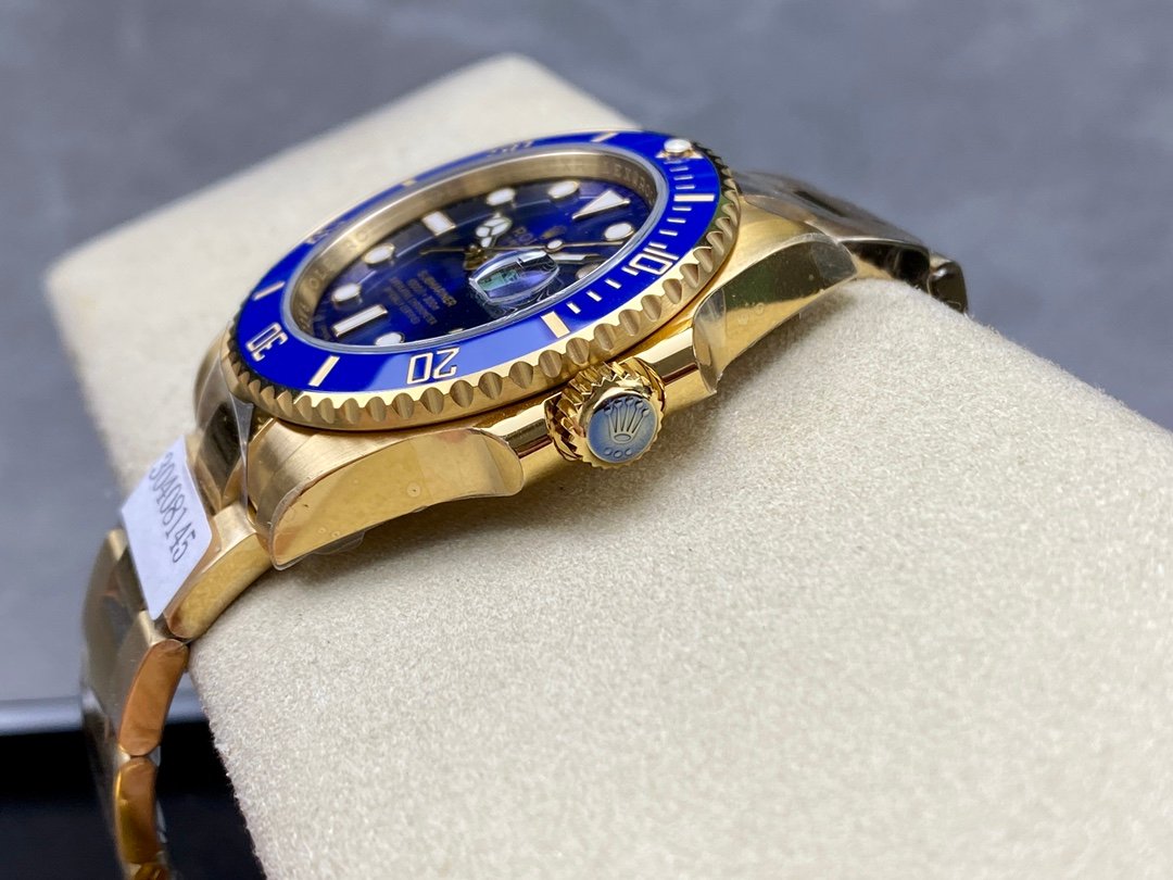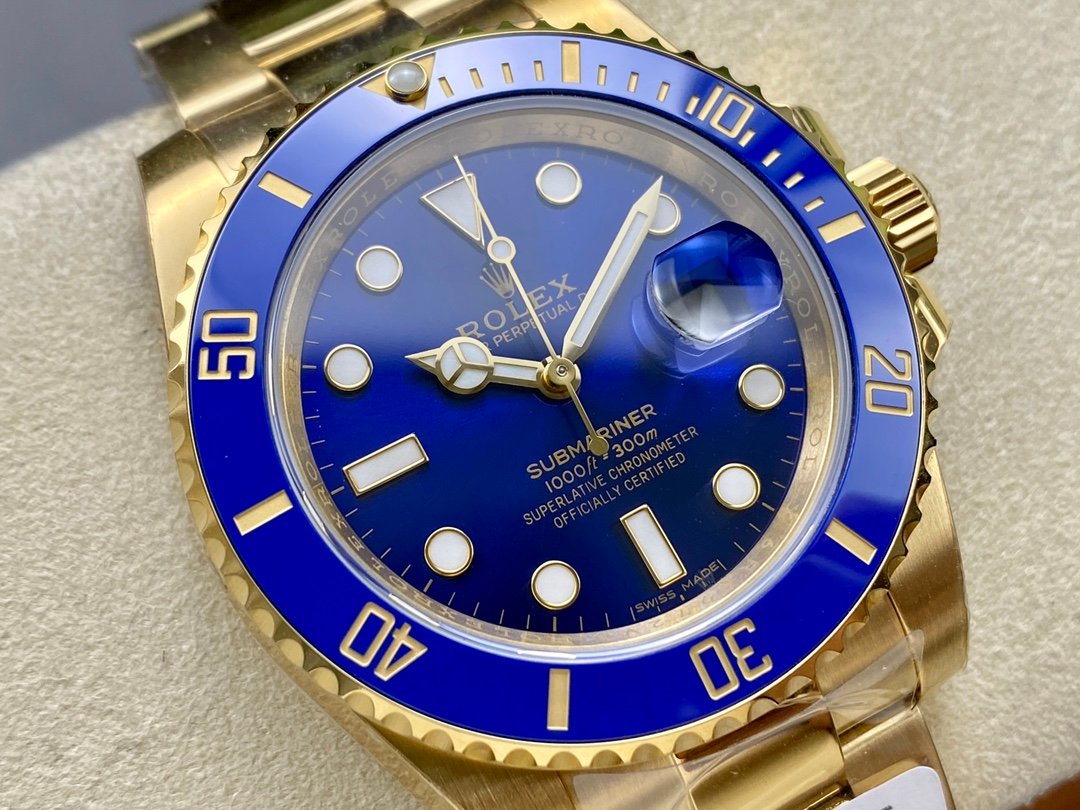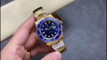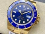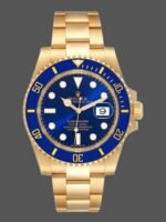 Rolex Submariner 116618 Yellow Gold Blue Dial 40mm Mens Replica Watch features a 40mm Yellow Gold case, Unidirectional blue ceramic bezel with 60 minute graduation.Blue dial with luminous inlay hands and hour markers. Date calendar at 3 o’clock aperture.Scratch resistant sapphire crystal with Cyclops lens,Yellow gold Oyster bracelet with Oysterlock clasp.