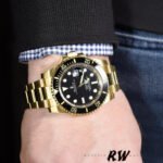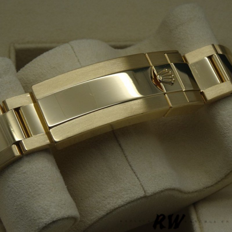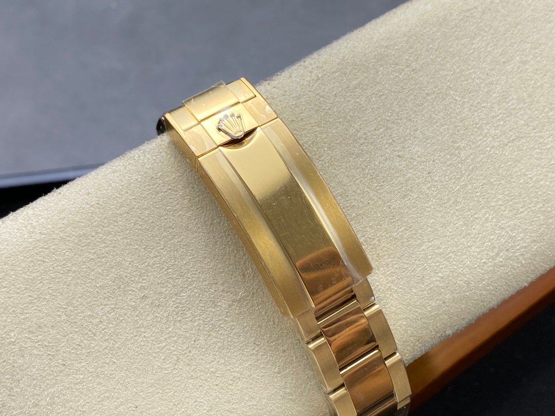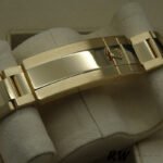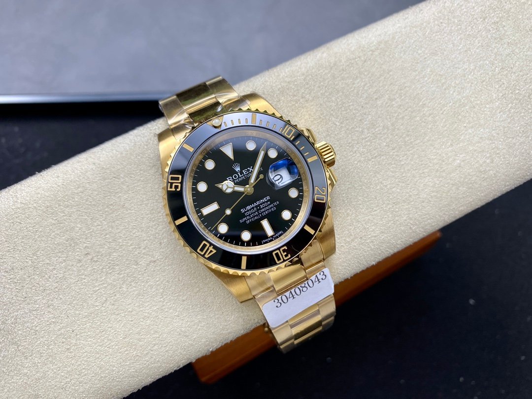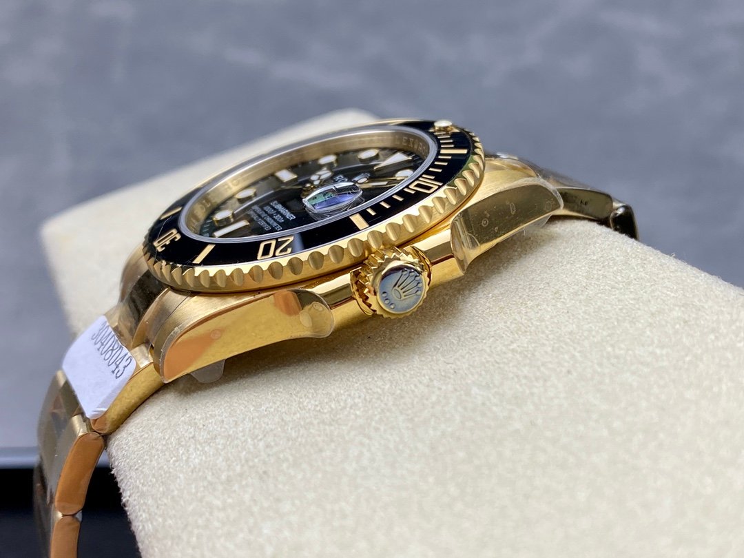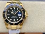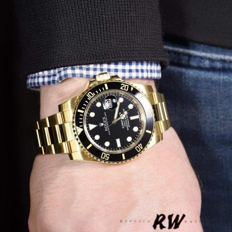 Rolex Submariner Date 116618LN Black Dial 40mm Mens Replica Watch. 40mm yellow gold case, screw-down crown with triplock triple waterproofness system, unidirectional rotatable bezel with black Cerachrom insert and gold coated numerals and graduations, scratch-resistant sapphire crystal with cyclops lens over the date, black dial, hour markers lumed in brilliant blue chromalight and a beefy Oyster bracelet with the glidelock system.