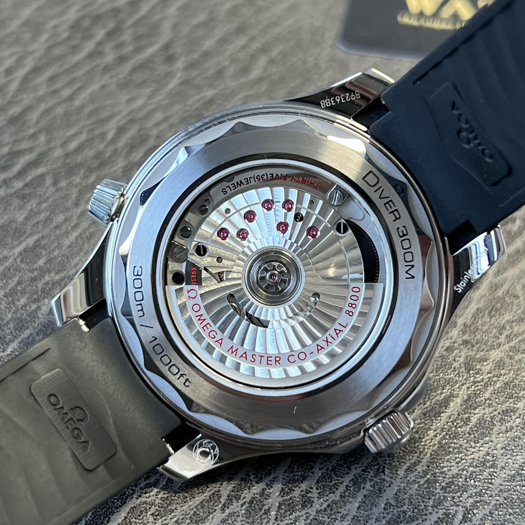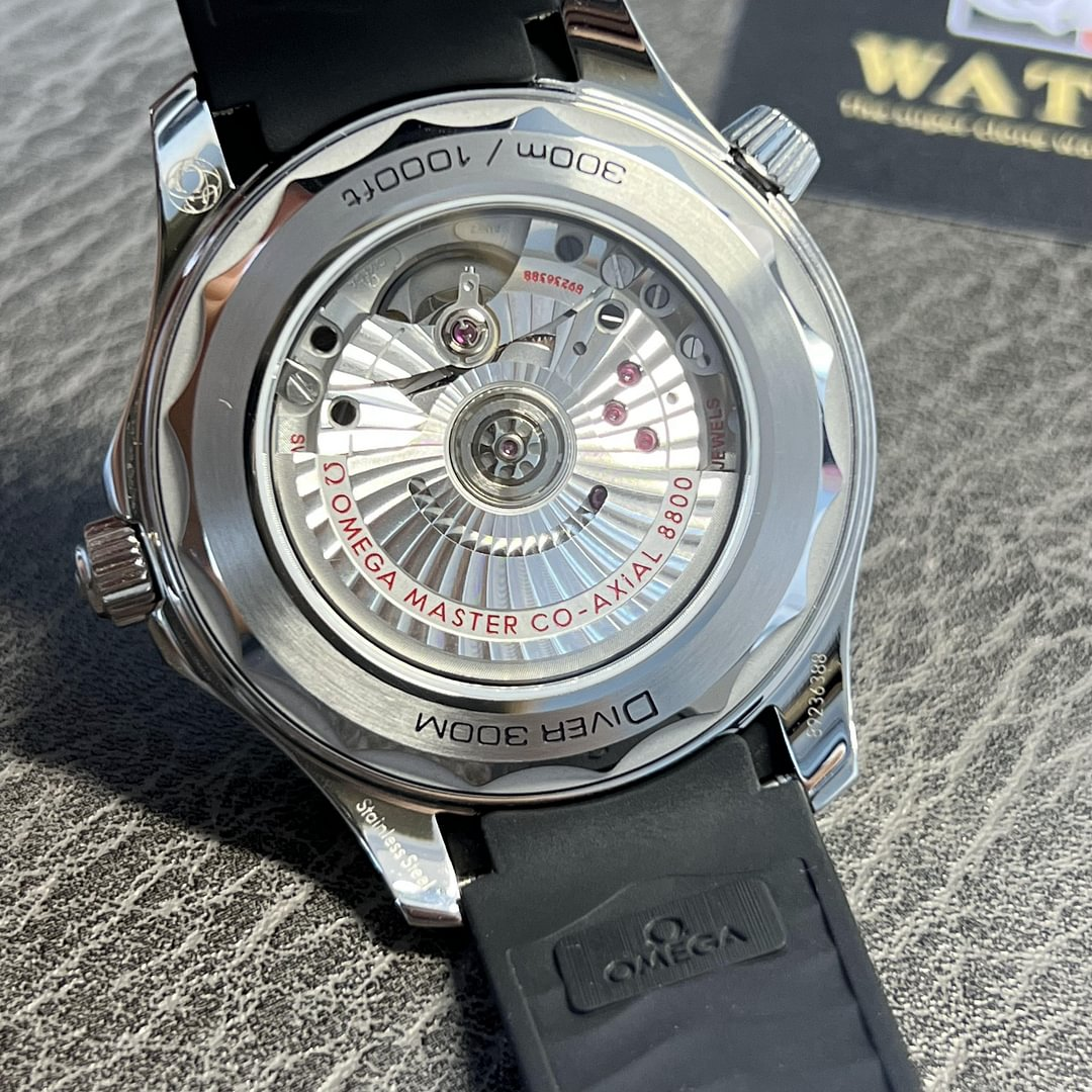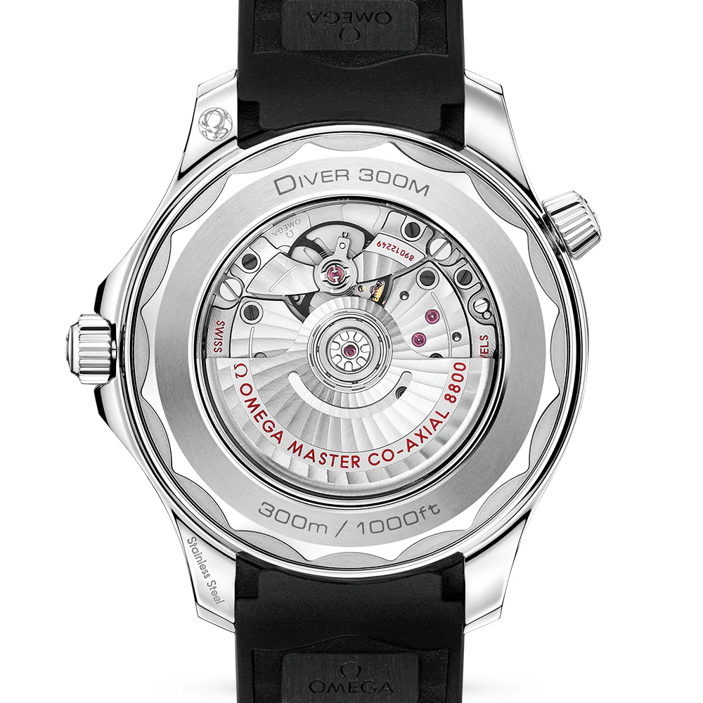 The Omega Seamaster Professional Diver 300M watch has been appealing to a mass audience since 1993. Perfectly equipped as a professional dive tool but equally as stylish for wearing every day of the week, this Omega Seamaster Diver 300M watch is a stainless steel model with a polished black ceramic dial that Features laser-engraved waves and a date window at 6 o’clock. Its Super-LumiNova treated hour markers and hands are rhodium plated and are framed by a black polished ceramic bezel with a 60-minute dive scale finished in white enamel. All elements on the dial are protected by a strong and durable domed sapphire crystal glass front, which shields it from dust, denting, heat, moisture and light damage. Inside the 300-meter water resistant case of this men’s Omega Seamaster Diver 300M watch is the Omega Master Chronometer Calibre 8800, which provides a useful 55-hour power reserve once fully wound. To uphold the watch’s impressive water resistant capability, the model is equipped with a screw-down crown and caseback as well as a conically shaped helium escape valve, whilst a sapphire exhibition feature grants an exclusive view into the manufacture of the dive watch’s beating heart. The Omega Seamaster watch secures comfortably to the wrist with a sleek black rubber strap and steel fastening.