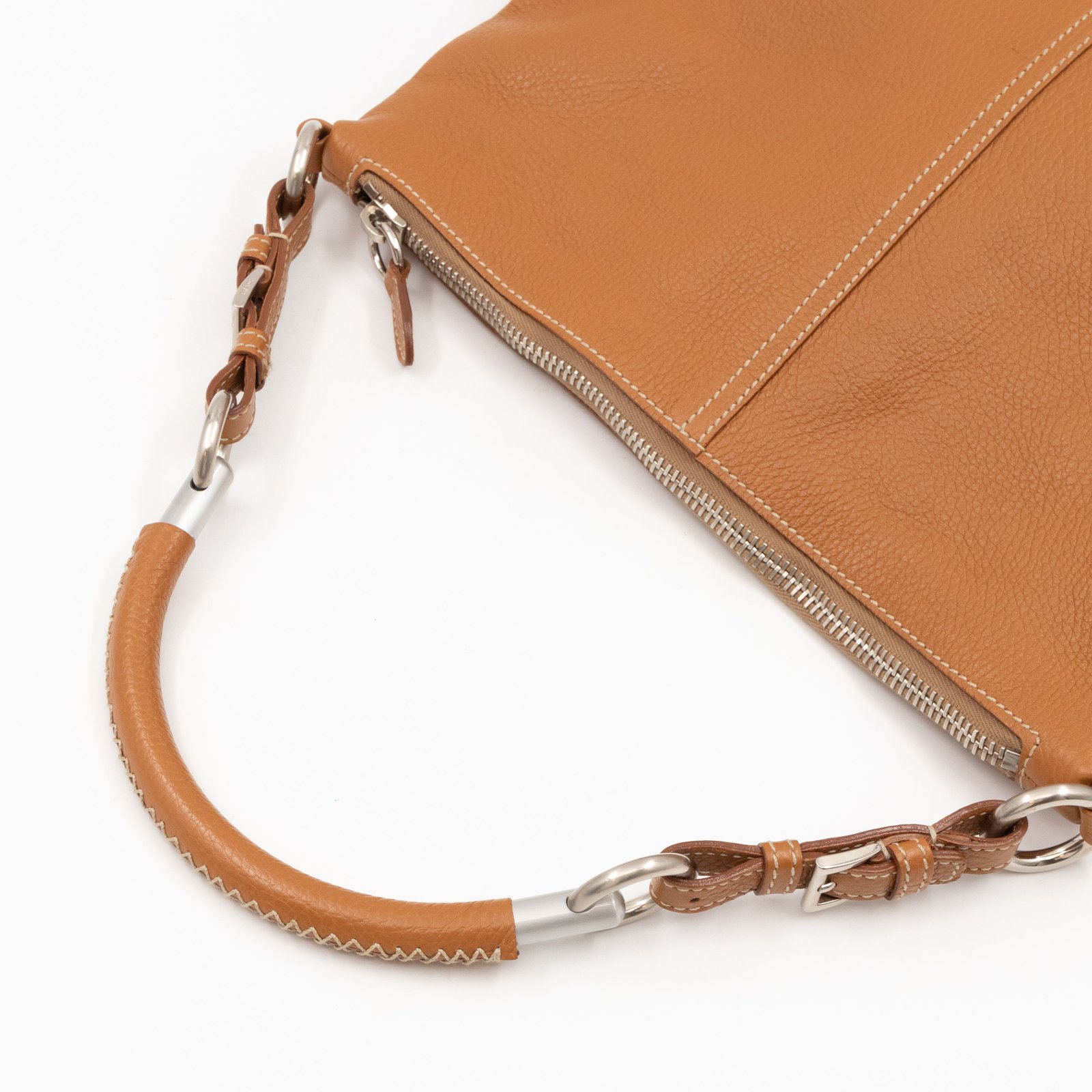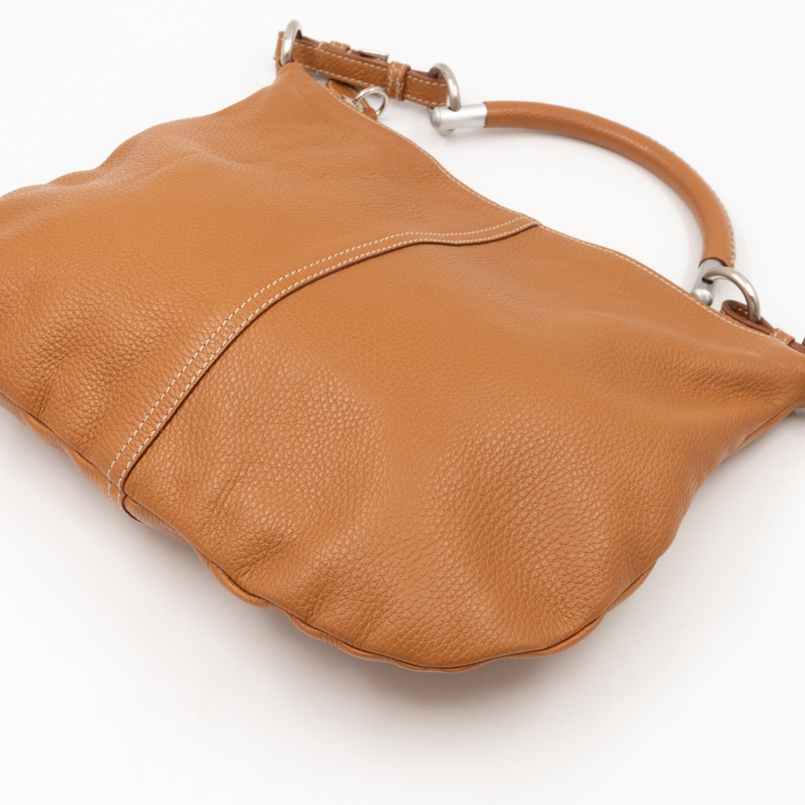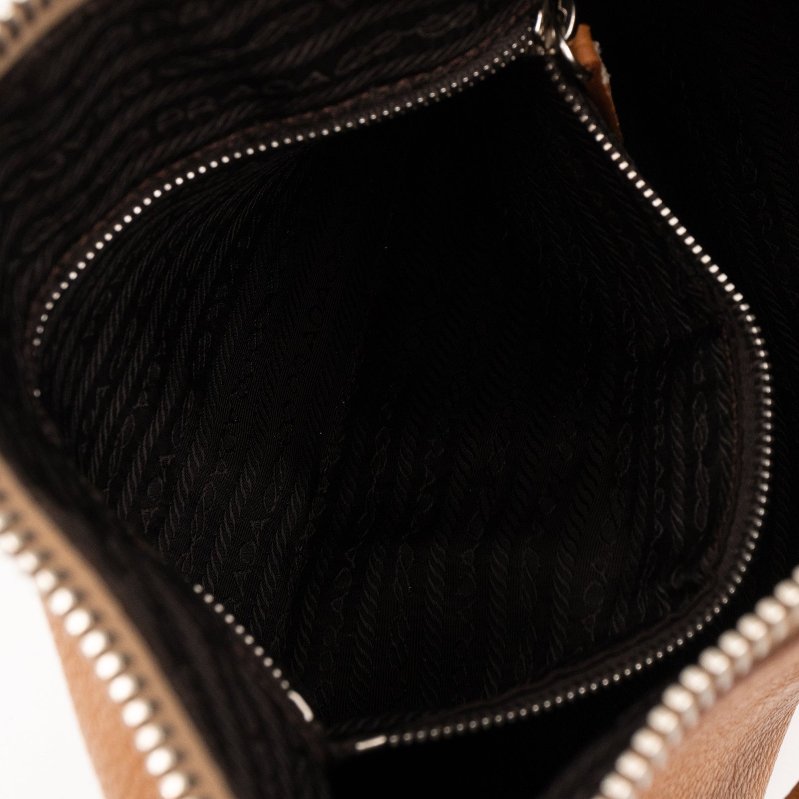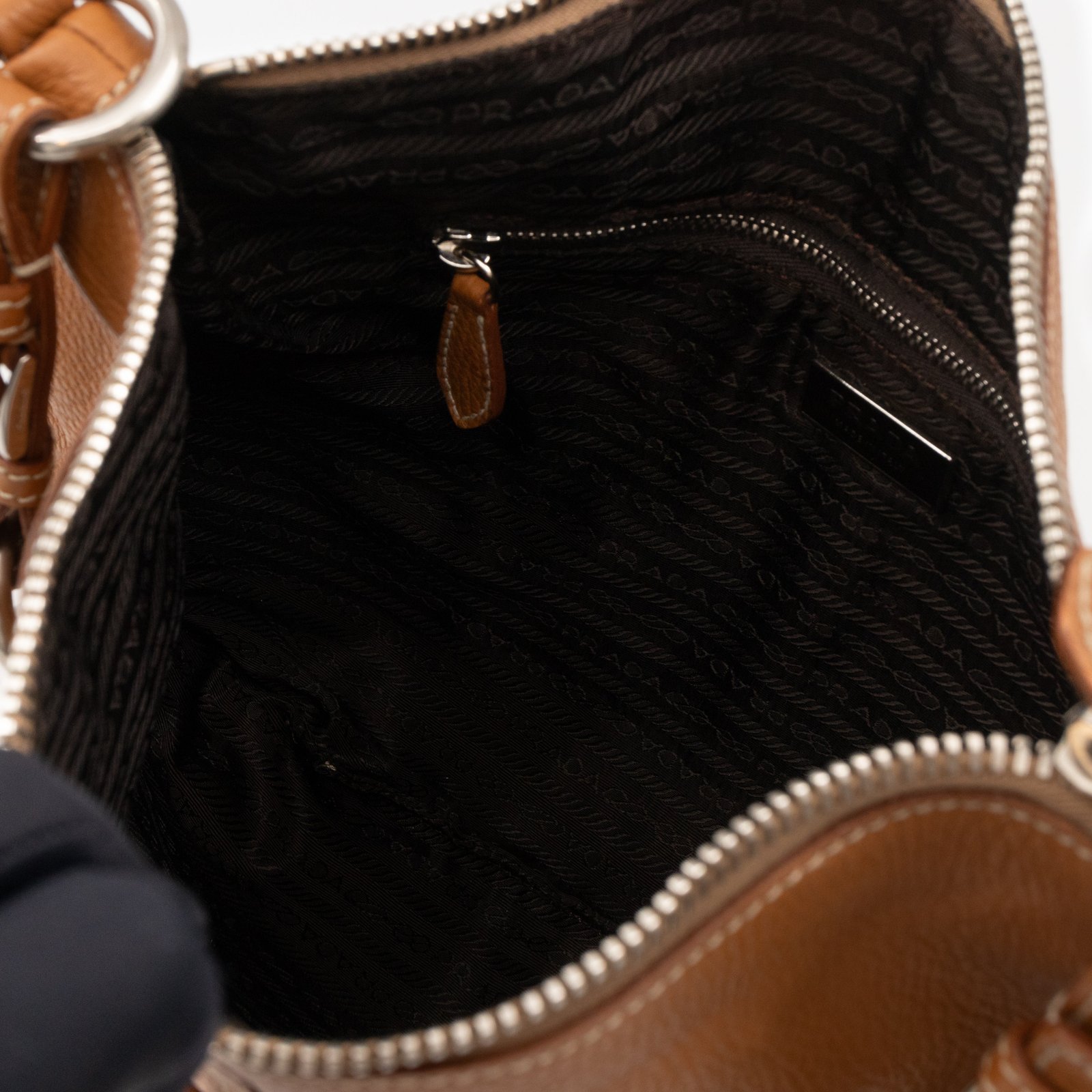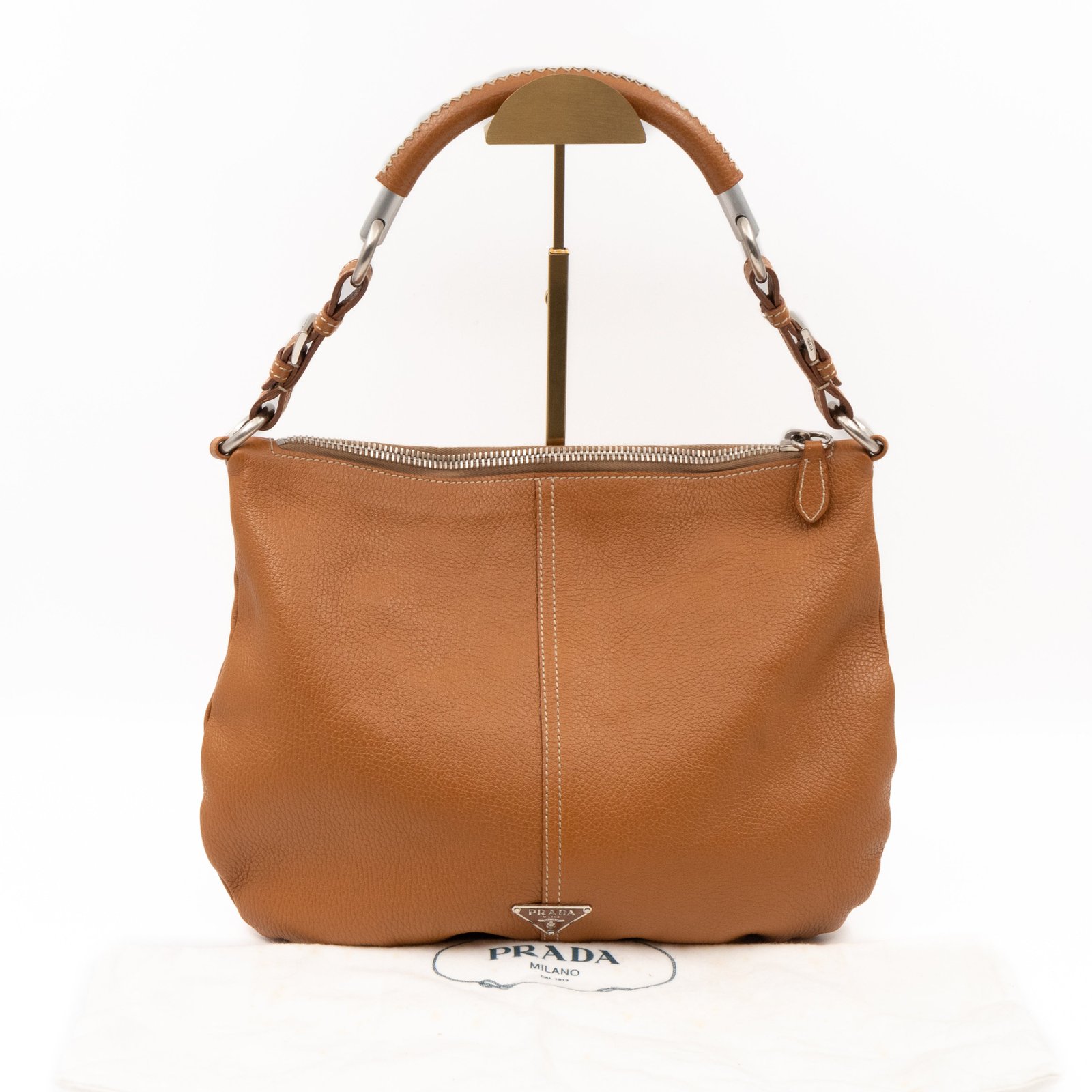 This is a pretty Prada shoulder bag. Very convenient shoulder bag in a brown leather, combined with silver-tone hardware. Top zipper open to a zipper pocket. Great choice for daily use.